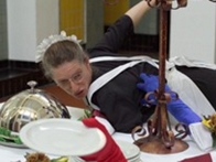 De handen die uit de tafel tevoorschijn komen, de borden aangeven voor het buffet en de serveerster kietelen zijn sowieso al zeer gepassioneerd.